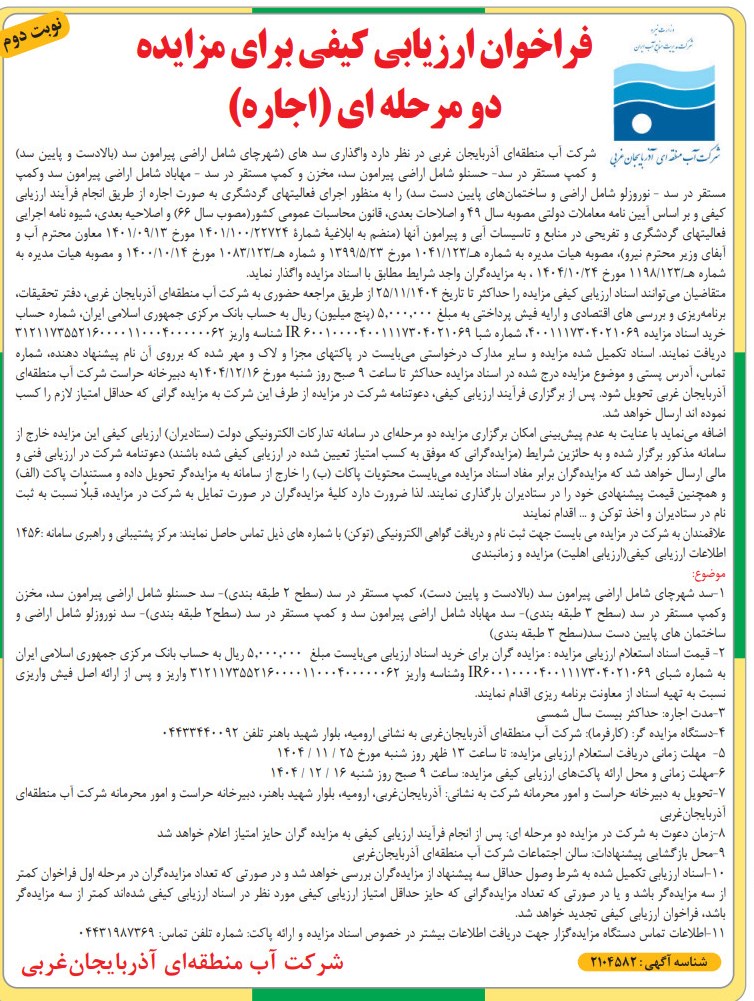 شرکت آب منطقهای آذربایجانغربی در نظر دارد واگذاری (اجارۀ) سد، مخزن و کمپ مستقر در سد حسنلو، را به منظور اجرای فعالیتهای گردشگری به صورت اجاره را بر اساس آیین نامه معاملات دولتی مصوبه سال 49، قانون محاسبات عمومی کشور مصوب سال66 و اصلاحیه بعدی، شیوه نامه اجرایی فعالیتهای گردشگری و تفریحی در منابع و تاسیسات آبی پیرامون آنها به شماره 27378/182/1401 مورخ 10/11/1401، مستندات پشتیبان شیوهنامه اجرایی فعالیتهای گردشگری و تفریحی در منابع و تاسیسات آبی پیرامون آنها به شماره 11102/100/98 مورخ 20/6/98، مصوبات هیات مدیره به شماره هـ 123/1041 مورخ 23/5/99 و شماره هـ 123/1083 مورخ 14/10/1400 حداکثر بمدت بیست سال به متقاضیان واجد شرایط مطابق با اسناد ارزیابی مزایده به اجاره واگذار نماید.