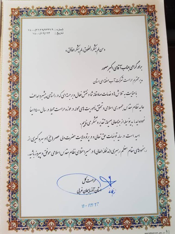 در این لوح تقدیر آمده است: با عنایت تلاشها و خدماات صادقانه شما و نقش فعال و برجسته ای که در راستای پیشبرد اهداف عالیه نظام مقدس جمهوری اسلامی و تحقق ماموریت های محوله در حوزه حراست محیط در سال1400 ایفا نموده اید؛ بدینوسیله از جنابعالی تقدیر وتشکر می نماییم .