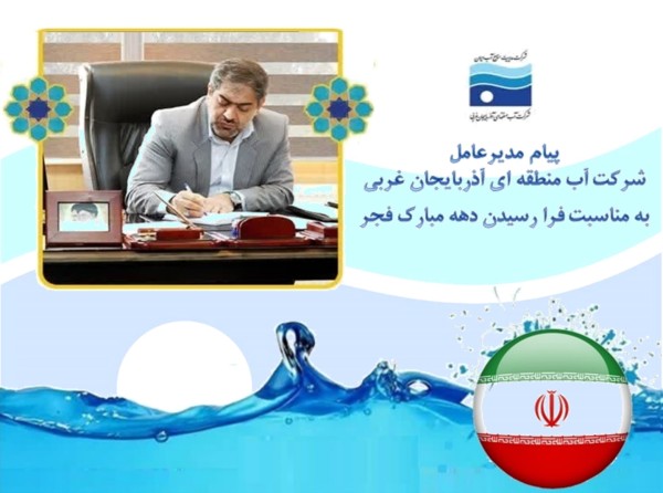 اینجانب ضمن گرامیداشت یاد و خاطره بنیانگذار کبیر انقلاب اسلامی حضرت امام خمینی(ره)، شهدای والامقام و ایثارگران دوران های انقلاب اسلامی، دفاع مقدس، مدافعین حرم و امنیت فرارسیدن ایام الله مبارک دهه فجر و چهل و پنجمین سالگرد پیروزی شکوهمند انقلاب اسلامی را به ملت شریف ایران، همکاران گرانقدرم در شرکت آب منطقه ای آذربایجان غربی تبریک و تهنیت عرض می کنم.