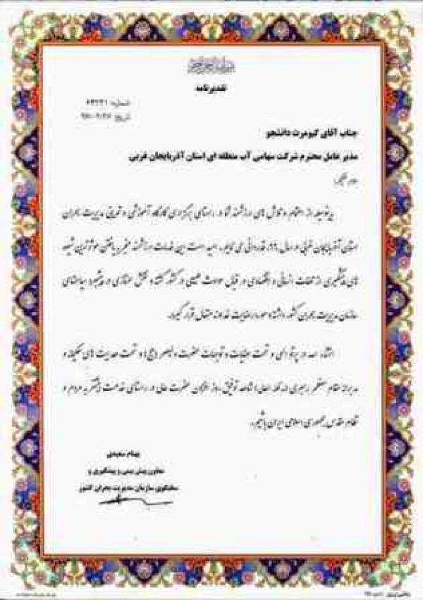 به گزارش روابط عمومی شرکت آب منطقه ای آذربایجان غربی، دراین لوح تقدیر آمده است: بدینوسیله از اهتمام و تلاشهای ارزشمند شما در راستای برگزاری کارگاه آموزشی و تمرینی مدیریت بحران استان آذربایجان غربی در سال 96 قدردانی می نمایم. امید است این خدمات ارزشمند منجر به یافتن موثرترین شیوه های پیشگیری از تلفات انسانی و اقتصادی در قبال حوادث طبیعی در کشور گشته و نقش ممتازی در پیشبرد سیاستهای سازمان مدیریت بحران کشور داشته و مورد رضایت خداوند متعال قرار گیرد.