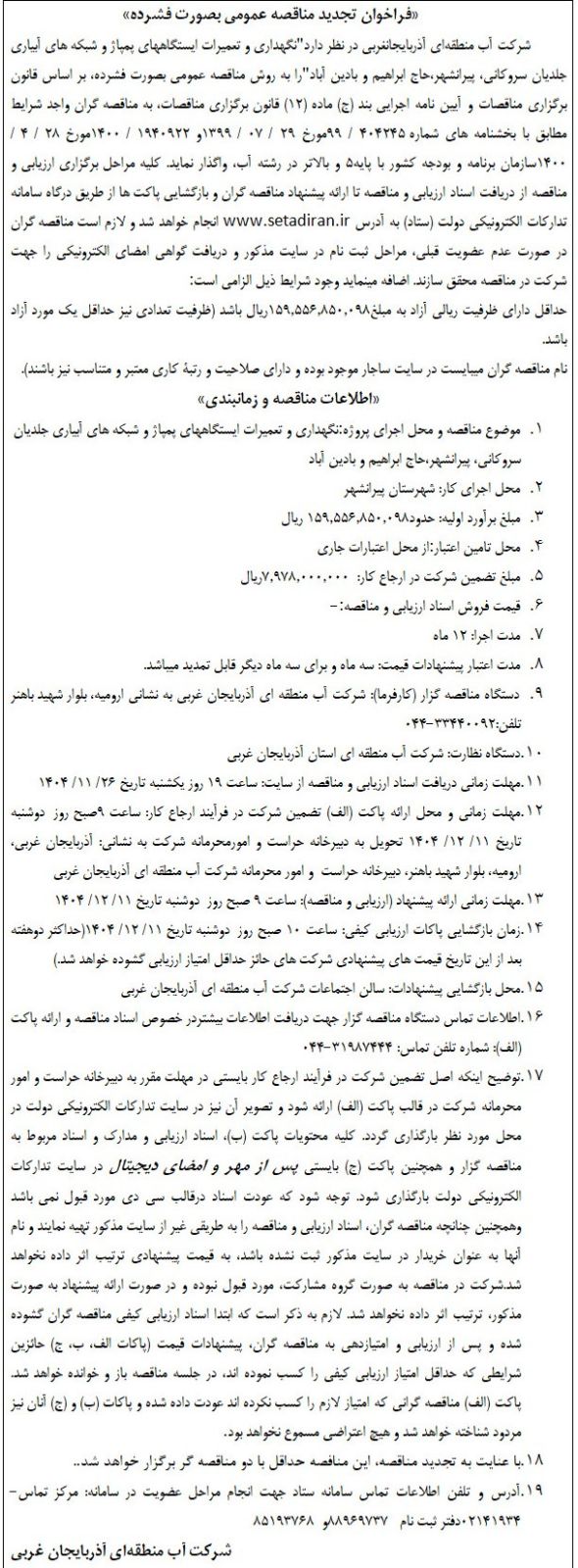 تجدید مناقصه عمومی به صورت فشرده پروژه نگهداری و تعمیرات ایستگاههای پمپاژ و شبکه های آبیاری جلدیان سروکانی، پیرانشهر،حاج ابراهیم و بادین آباد