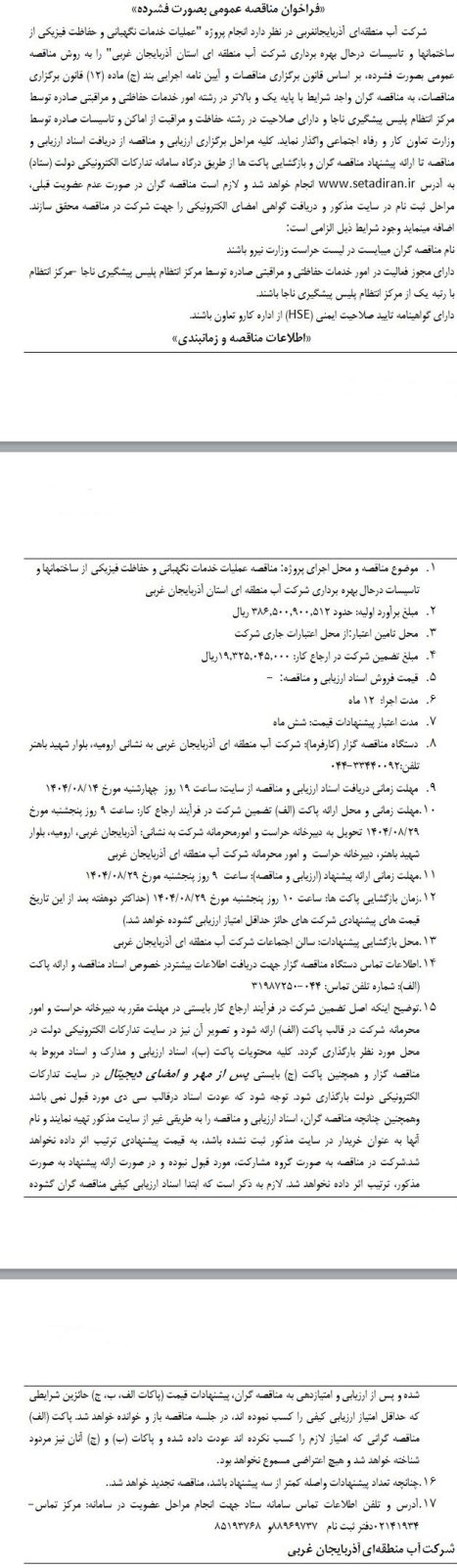 عملیات خدمات نگهبانی و حفاظت فیزیکی از ساختمانها و تاسیسات درحال بهره برداری شرکت آب منطقه ای استان آذربایجان غربی |
