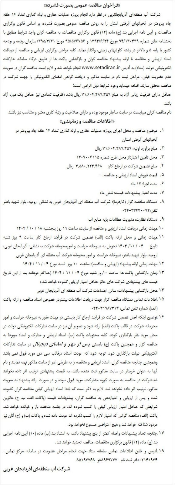 عملیات حفاری و لوله گذاری تعداد 16 حلقه چاه پیزومتر در آبخوانهای آبرفتی استان |