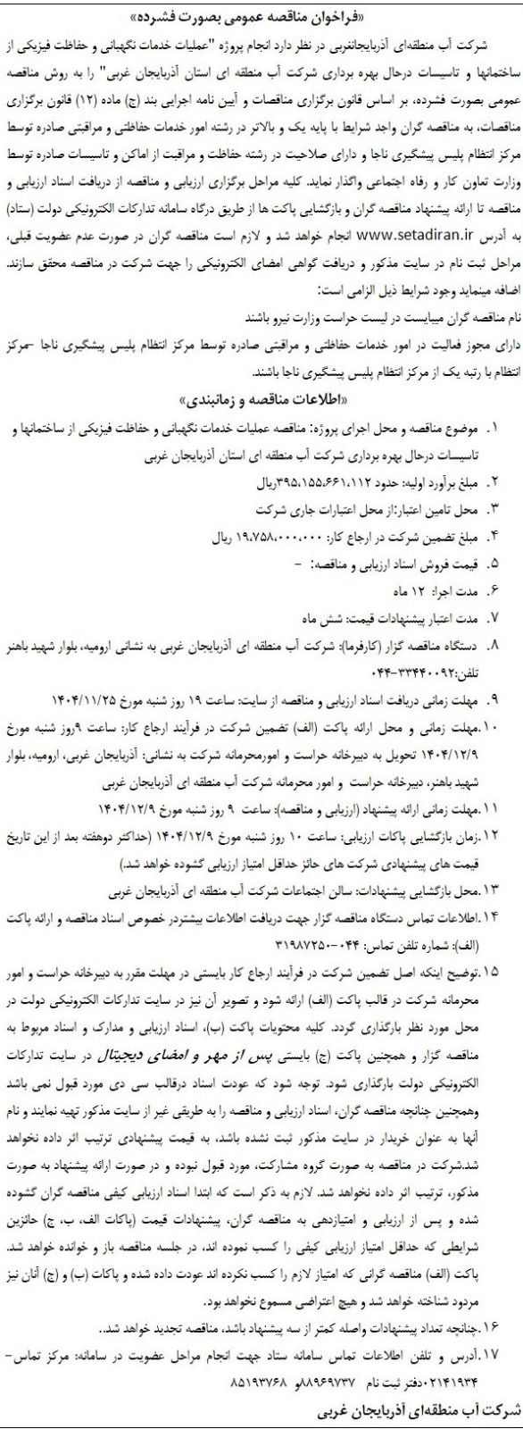 عملیات خدمات نگهبانی و حفاظت فیزیکی از ساختمانها و تاسیسات درحال بهره برداری شرکت آب منطقه ای استان آذربایجان غربی |